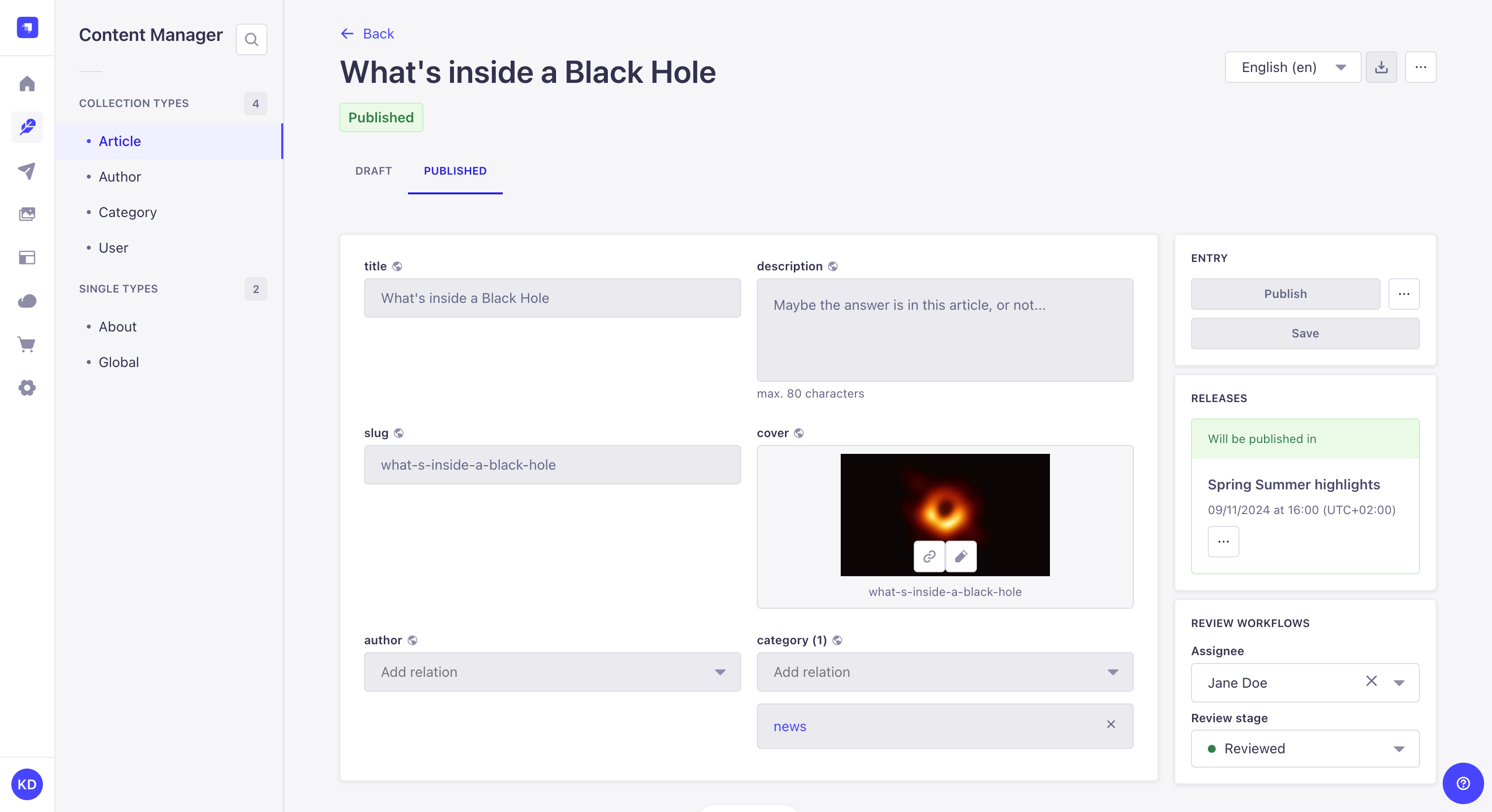 Strapi allows you to manage your content throughout its whole lifecycle, whether you are working on its draft version, about to finish it and share it with the world, or wanting to delete it when it's obsolete.